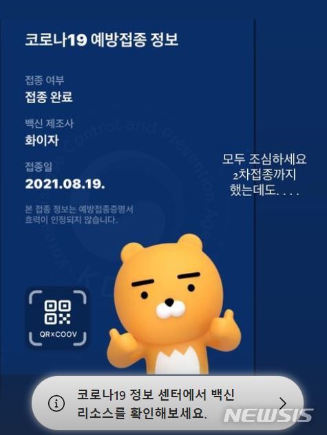 공개된 사진에는 강예원이 지난 8월 화이자 백신을 맞은 것으로 추정된다.