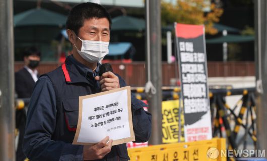 [서울=뉴스핌] 최상수 기자 = 양동규 민주노총 부위원장이 26일 오전 서울 여의도 한국산업은행 앞에서 열린 '기업결합 심사 승인 부당압력 산업은행 규탄, 대우조선·아시아나항공 재벌특혜매각 철회 촉구' 기자회견에서 발언을 하고 있다. 2021.10.26 kilroy023@newspim.com 저작권자(c) 글로벌리더의 지름길 종합뉴스통신사 뉴스핌(Newspim), 무단 전재-재배포 금지