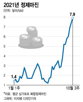 26일 정유업계에 따르면 지난주 평균 싱가포르 복합정제마진은 배럴 당 7.9달러를 기록하며 2017년 9월 배럴 당 9달러 이후 최고치를 찍었다. 보통 정유업계에선 정제마진 손익분기점을 배럴 당 3~4달러로 본다.