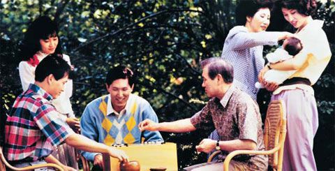 노태우 전 대통령이 재임 시절 청와대에서 아들 재헌씨가 지켜 보는 가운데 사위 최태원 SK 회장과 바둑을 두고 있다. /조선DB |