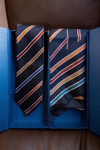 상자 안에는 감색 바탕에 빨간색, 노란색, 파란색 사선 무늬가 새겨진 넥타이와 스카프 한 쌍이 들어 있었다.