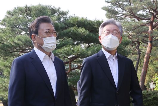 문재인 대통령과 더불어민주당 이재명 대선 후보가 26일 현직 대통령과 여당 후보로서 첫 공식 만남을 가졌다. 청와대는 이 후보 측근들이 연루돼 있는 대장동 개발 의혹 사건과 관련해선 한마디도 나누지 않았다고 밝혔다. 하지만 야당은 “대통령이 수사 대상인 이 후보와 화기애애한 만남을 가진 것은 검찰에 수사 가이드라인을 준 꼴”이라며 “명백한 선거 개입 행위”라고 반발했다.
