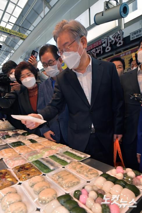 더불어민주당 이재명 대선 후보가 27일 서울 관악구 신원시장을 방문, 상점에서 떡을 고르고 있다.
