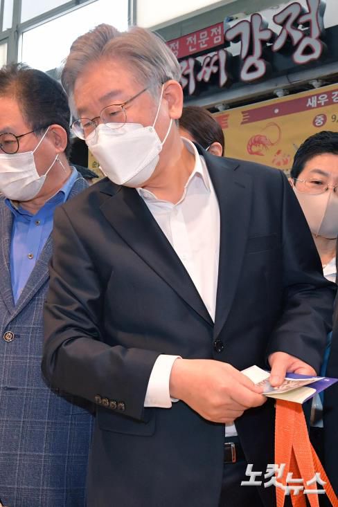 전통시장상품권으로 떡 구입하는 이재명 대선 후보