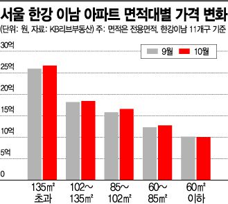 앞서 26일 발표된 대출 추가 대책에 따른 매수세 위축 현상은 이 같은 흐름을 더 부추길 수 있다는 전망이 나온다. 서울 아파트 가격 급등에 대한 부담으로 최근 소형아파트라도 매입하려는 수요가 늘었지만 대출 규제가 강화되면 실수요자마저 접근하기가 쉽지 않아지기 때문이다. 함영진 직방 빅데이터랩장은 "한 달 간의 흐름만으로 소형아파트 수요 감소를 논하기는 어렵다"면서도 "잠재적 수요자 입장에서는 11월 금리인상 가능성에 따른 이자부담, 거래 위축에 따른 공실 리스크 등을 따져볼 때 소형아파트 투자 유인이 떨어진다고 생각할 수도 있다"고 말했다.
