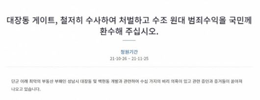 앞서 청와대 국민청원 게시판에는 지난 26일 ‘대장동 게이트, 철저히 수사하여 처벌하고 수조 원대 범죄수익을 국민께 환수해 주십시오’라는 글이 올라왔다. 청원인은 “단군 이래 최악의 부동산 부패인 대장동 및 백현동 개발과 관련해 수십 가지 비리 의혹이 있고 관련 증인과 증거들이 쏟아져 나오고 있다”라며 “문재인 대통령이 직접 진실을 밝히고 범죄수익을 환수해주시라. 검찰 지휘에 나서 숨김없는 수사로 진실을 낱낱이 밝혀내고 비리의 몸통에서부터 이미 구속된 대원들 그리고 법조계와 정치권 비호세력에 이르기까지 모두 처벌해달라”라고 요구했다.