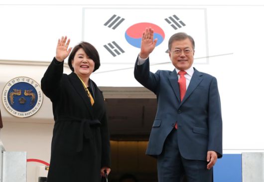 문재인 대통령 부부가 지난 2018년 11월 주요 20개국 정상회의 계기 아르헨티나 등 해외 순방을 위해 성남 서울공항을 출발하기 전 손을 흔들어 인사하고 있다. /청와대 |