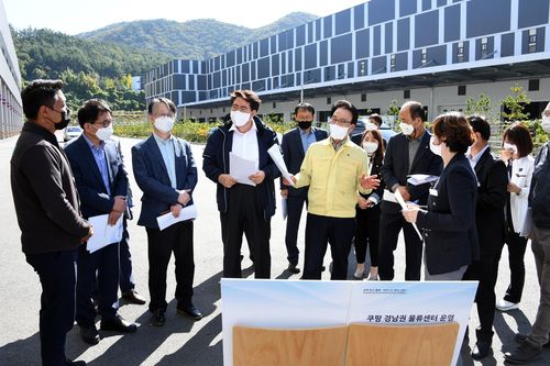 ▲ 김하용 경남도의회 의장은 28일 심상동 운영위원장과 함께 부산진해경제자유구역청에서 추진하는 보배복합지구, 남문지구, 두동지구 쿠팡물류센터 등 경남지역 개발현장에 대한 행정사무감사 점검을 했다. 김 의장은 "연구와 산업이 복합된 보배복합지구가 20년 만에 본격 추진됨에 따라 차질 없이 개발하고, 쿠팡물류센터는 택배기사들의 처우 개선에 앞장서달라"고 당부했다. (창원=연합뉴스)