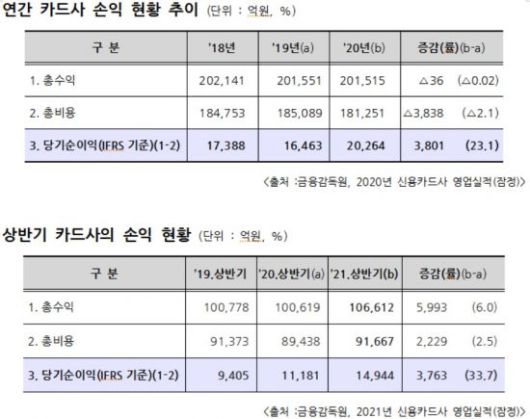 금융감독원이 발표한 신용카드사의 2020년 결산 당기순이익은 전년 대비 3800억원 늘어난 2조264억원이었으며, 올해 카드사들은 상반기에만 1조4944억원의 당기순이익을 기록했는데, 이는 상반기에만 전년도 당기순이익의 70%를 상회하는 수치다.