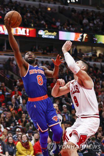 뉴욕은 29일(한국시간) 미국 일리노이주 시카고의 유나이티드 센터에서 열린 2021-2022 NBA 정규리그 시카고와 원정경기에서 상대의 막판 추격을 힘겹게 따돌리고 104-103으로 이겼다.