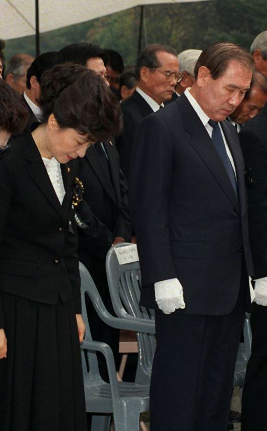 박근혜 전 대통령(당시 한나라당 부총재)과 노태우 전 대통령이 1999년 10월 26일 국립서울현충원에서 열린 박정희 전 대통령 20주기 행사에 참석해 박 전 대통령 묘소 앞에서 묵념하고 있다. /조선일보DB |