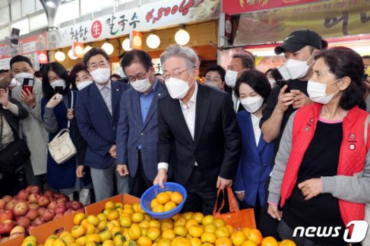 이재명 더불어민주당 대선 후보가 지난 27일 오전 서울 관악구 신원시장을 방문, 과일 상점에서 감을 사고 있다./사진=뉴스1 |