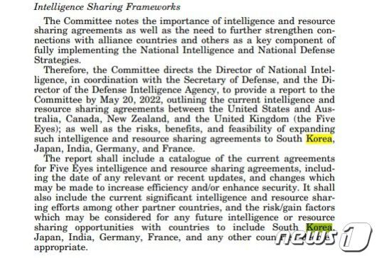 군사위는 또 DNI가 국방부와 조율해 확대시 이점과 위험성, 각국이 기여할 수 있는 부분 등에 대한 검토를 거쳐 내년 5월 20일까지 의회에 보고하라는 내용도 담았었다.