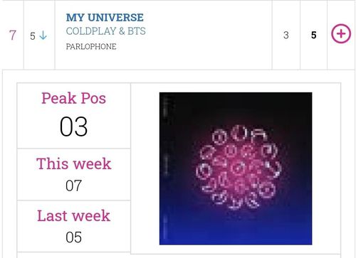 (서울=연합뉴스) 이태수 기자 = 그룹 방탄소년단과 밴드 콜드플레이가 협업한 노래 '마이 유니버스'(My Universe)가 영국 오피셜 싱글차트 톱 100에서 전주보다 2위 하락한 7위를 기록했다.