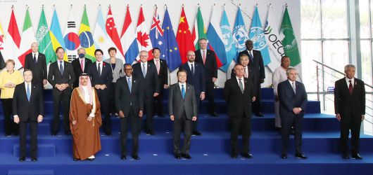문재인 대통령이 30일(현지시간) 이탈리아 로마 누볼라 컨벤션 센터에서 열린 주요 20개국(G20) 정상회의 공식 환영식에서 기념촬영을 하고 있다. 앞줄 왼쪽부터 이탈리아 마리오 드라기 총리,사우디아라비아 파이살 빈 파르한 알 사우드 외교장관, 르완다 폴 카가메 대통령, 문재인 대통령, 브라질 자이르 보우소나루 대통령, 아르헨티나 알베르토 페르난데스 대통령,싱가포르 리센룽 총리. 연합뉴스 |