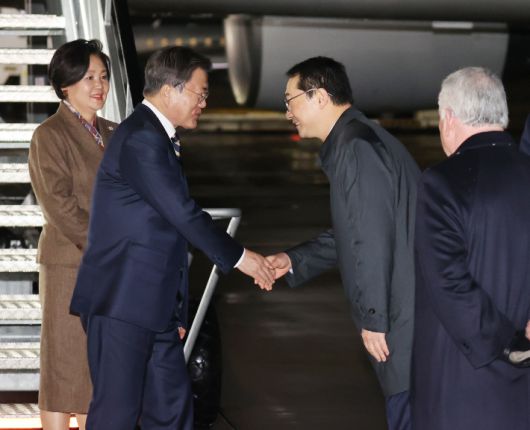문재인 대통령은 31일(현지시간) 제26차 유엔기후변화협약 당사국총회(COP26) 및 한-영 정상회담을 위해 영국 글래스고 국제공항에 도착했다. 사진은 김건 주영 한국대사와 인사하는 모습. 연합뉴스유럽 3개국을 순방중인 문재인 대통령은 1일 대구형 일자리 상생협약 체결을 축하했다.