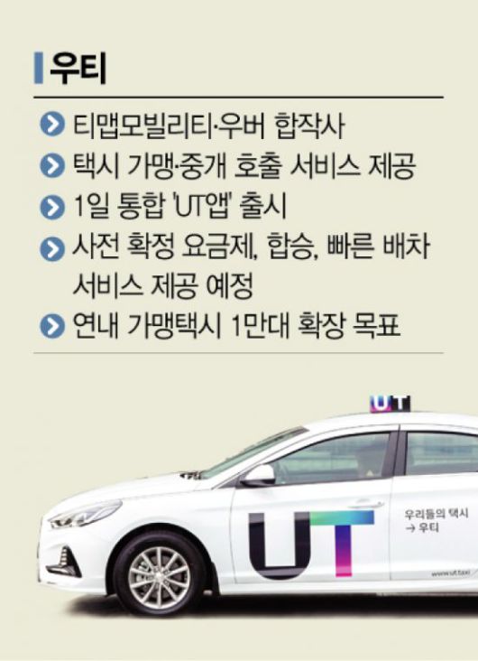‘우티(UT)’가 카카오택시 천하에 도전장을 내민다. 우티는 글로벌 기업 우버와 SK텔레콤의 자회사 티맵모빌리티의 합작회사다. ‘우리들의 택시’라는 의미로 기사, 승객, 지역 공동체 간 상생과 발전의 의미를 담았다. 우티는 업계 최강자 카카오모빌리티와 최근 토스에 인수된 ‘타다’에 맞서 택시 플랫폼 경쟁에 본격적으로 돌입한다.