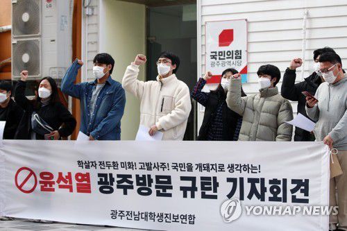 광주·전남 대학생진보연합도 이날 오후 국민의힘 광주시당 앞에서 기자회견을 열고 "윤 전 총장이 광주에 오는 것은 진정한 사과가 아니라 쇼라는 것을 국민들은 알고 있다"며 "광주 땅을 밟을 자격도 없다"고 비판했다.