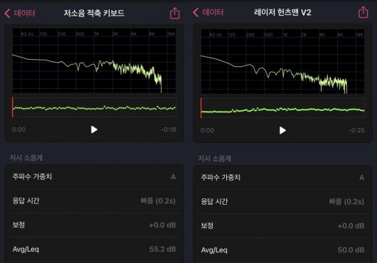 체리 MX 저소음 적축이 탑재된 게이밍 키보드(C모사 제품)와 비교할 때는 어떨까? 같은 환경에서 타건해본 결과 체리 MX 저소음 적축 게이밍 키보드는 평균 55.2dB을 기록했다. 반면, 레이저 헌츠맨 V2는 5.2dB이나 낮은 평균 50dB을 기록했다.