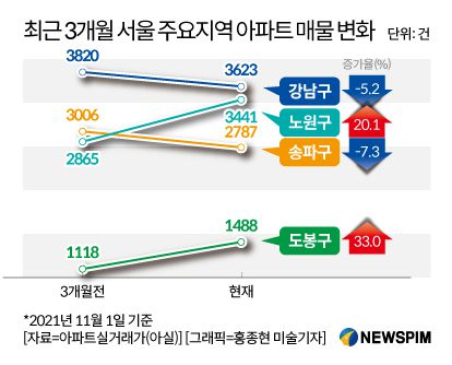아파트실거래가(아실)에 따르면 최근 3개월간 서울 지역 내에서 매물이 가장 많이 늘어난 곳은 도봉구로 1118건에서 1488건으로 33.0% 증가했다. 이어 노원구가 2865건에서 3441건으로 20.1% 늘어 뒤를 이었다.