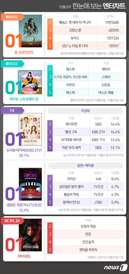 (서울=뉴스1) 정유진 기자 = ◆ 영화='듄' 1위(영화진흥위원회 영화관입장권 통합 전산망 10월29일~10월31일 집계)