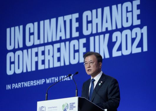문재인 대통령이 1일(현지시각)영국 글래스고 스코틀랜드 이벤트 캠퍼스(SEC)에서 열린 제26차 유엔 기후변화협약 당사국총회(COP26)에서 기조연설을 하고 있다. [연합] |