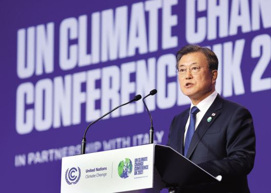 제26차 유엔기후변화협약 당사국총회 정상회의(COP26)에 참석중인 문 재인 대통령이 국가온실가스감축목표(NDC)를 2030년까지 40% 감축하겠다고 발표한 것과 관련 청와대가 ‘국내 산업을 보호하기 위한 조치’라고 평가했다.