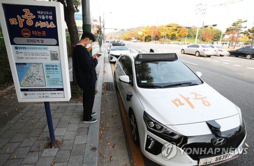 (시흥=연합뉴스) 최해민 기자 = 콜택시처럼 스마트폰 앱으로 호출해 이용할 수 있는 수요 응답형 자율주행차 시연 행사가 2일 오후 경기도 시흥시 배곧신도시 일원에서 진행됐다.