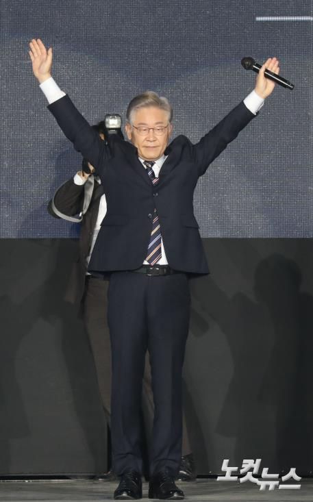 더불어민주당 이재명 대선후보가 2일 오후 서울 송파구 올림픽경기장 KSPO돔에서 열린 제20대 대통령선거 선거대책위원회 출범식에서 후보자 연설을 마치고 두손을 들어보이고 있다.저작권자 © CBS 노컷뉴스 무단전재 및 재배포 금지