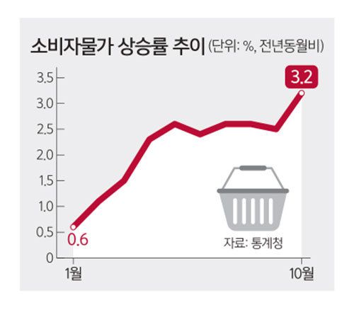 소비자물가 상승률은 올해 1월 0.6%에서 2월 1.1%, 3월 1.5%로 차츰 오르더니 4월에는 2.3%를 기록하며 2%대에 진입했다. 이후 9월(2.5%)까지 6개월째 2%대를 기록하다 지난달 3%대로 뛰어올랐다.