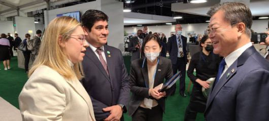 문재인 대통령이 1일(현지시각) 영국 글래스고 스코틀랜드 이벤트 캠퍼스(SEC)에서 열린 제26차 유엔기후변화협약 당사국총회(COP26)에 참석중 정상라운지에서 까를로스 알바라도 께사다 코스타리카 대통령과 대화하고 있다.(사진=청와대 제공) |