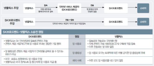 국내 망 사용료 논란은 SK브로드밴드와 넷플릭스 간 소송전에서 압축적으로 엿볼 수 있다. 2019년 11월 넷플릭스는 SK브로드밴드가 방송통신위원회에 낸 망 이용 대가 협상 중재 신청을 무시하고 일방적으로 법원에 채무부존재 확인 소송을 제기했고 이후 법적 공방이 본격화했다. 지난 6월, 1심 법원은 SK브로드밴드 손을 들어줬다. 넷플릭스 측은 즉각 항소했다.