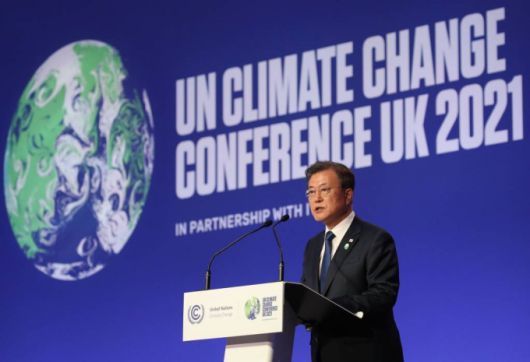 문 대통령은 "이번 COP26 특별정상회의에는 120여 개 나라 정상이 참석했다. 우리는 2030 NDC 목표를 상향 제시했고, 국제메탄서약 출범에도 함께 했다"며 "세계는 온실가스 배출을 줄이고, 산림과 토양생태계 보호를 위해서도 긴밀히 협력할 것이다. 이제 선진국과 개도국의 협력이 중요한 과제로 남았고, 개도국에서 선진국이 된 유일한 나라 대한민국이 앞장서야 할 과제다"고 강조했다.