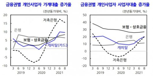 특히 개인사업자가 보유한 가계대출 증가율은 코로나19 발생 이후 은행권에서 하락하는 반면 비은행권에서 지속 상승세다. 특히 금리가 높은 캐피탈·카드·저축은행 증가율이 올해 1분기 이후 크게 늘었다.