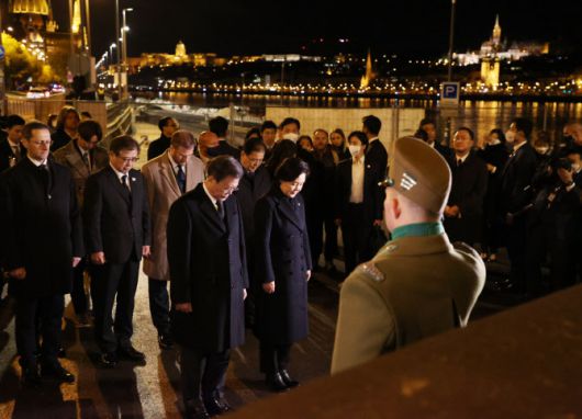 문 대통령과 김정숙 여사는 이날 부다페스트 국제 공항에 도착하자마자 곧바로 머르기트교 인근에 마련된 추모 공간으로 향했다. 검은 정장 차림으로 현장에 도착한 대통령 내외는 추모비에 헌화하고 묵념했다. 화환에는 ‘우리 국민의 영혼을 위로합니다. 대한민국 대통령 문재인’이라는 문구가 적혔다.