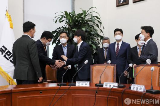 [서울=뉴스핌] 최상수 기자 = 3일 국회에서 열린 국민의힘 '이재명 비리 국민검증특별위원회' 임명장 수여식에서 이준석 대표(가운데)와 김진태 이재명 비리 국민검증 특별위원회 위원장(오른쪽)이 특위 위원들과 인사를 나누고 있다. 2021.11.03 kilroy023@newspim.com 저작권자(c) 글로벌리더의 지름길 종합뉴스통신사 뉴스핌(Newspim), 무단 전재-재배포 금지