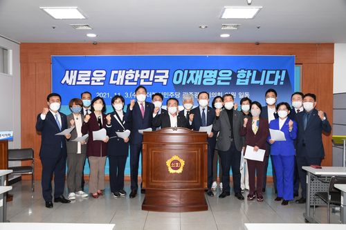 (광주=연합뉴스) 장덕종 기자 = 더불어민주당 소속 광주시의회의원들은 3일 광주시의회에서 기자회견을 열고 민주당 이재명 후보와 '원팀'으로 내년 대선 승리를 이뤄내겠다고 다짐했다.