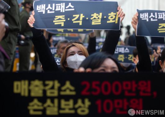 [서=뉴스핌] 윤창빈 기자 = 대한실내체육시설 총연합회 회원들이 3일 오후 서울 여의도 더불어민주당 당사앞에서 실내체육시설 백신패스 즉각철회를 요구하는 집회를 열고 구호를 외치고 있다. 2021.11.03 pangbin@newspim.com 저작권자(c) 글로벌리더의 지름길 종합뉴스통신사 뉴스핌(Newspim), 무단 전재-재배포 금지