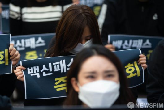 [서=뉴스핌] 윤창빈 기자 = 대한실내체육시설 총연합회 회원들이 3일 오후 서울 여의도 더불어민주당 당사앞에서 실내체육시설 백신패스 즉각철회를 요구하는 집회를 열고 피켓을 들고 있다. 2021.11.03 pangbin@newspim.com 저작권자(c) 글로벌리더의 지름길 종합뉴스통신사 뉴스핌(Newspim), 무단 전재-재배포 금지