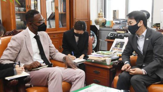 방한 중인 딘 가필드(왼쪽) 넷플릭스 공공정책 수석부사장이 3일 서울 여의도 국회 과학기술정보방송통신위원회에서 이원욱 위원장과 대화하고 있다. 뉴시스 |