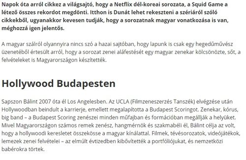 드라마 '오징어게임'의 음악 작업에 헝가리 음악 제작사가 동참했다는 내용을 전한 현지 언론 [헝가리 Index 홈페이지 캡처. 재판매 및 DB 금지] |