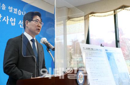 양승조 충남지사가 3일 공주 충남역사문화연구원에서 기자회견을 열고, 서산공항의 예비타당성 조사 대상 사업 선정 소식을 알리고 있다.