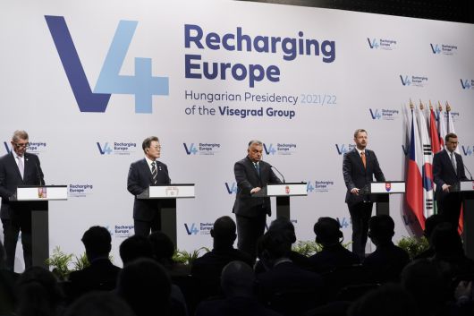 헝가리를 국빈 방문 중인 문재인 대통령이 4일(현지시간) 부다페스트 바르케르트 바자르 기자회견장에서 열린 한-비세그라드 그룹(V4.헝가리·폴란드·체코·슬로바키아) 공동 언론 발표에 참석하고 있다. 왼쪽부터 안드레이 바비시 체코 총리, 문재인 대통령, 빅토르 오르반 헝가리 총리, 에두아르트 헤게르 슬로바키아 총리, 마테우시 모라비에츠키 폴란드 총리. 연합뉴스 |