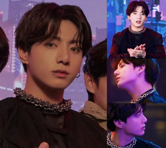 이 중 멤버 정국은 컬러 렌즈와 립, 눈썹 등 화려한 피어싱, 체인이 돋보이는 블랙 의상을 입고 판타지 웹툰을 찢은 비현실적이고 신비로운 아우라를 한껏 뿜어내 시선을 강탈했다.