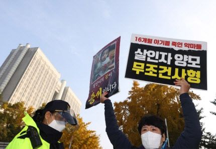 생후 16개월 된 입양아 정인양을 학대해 숨지게 한 혐의로 1심에서 무기징역을 선고받은 양모 장씨의 항소심 결심공판이 열린 5일 오전 서울 서초구 서울고법 앞에서 시민들이 손피켓을 들고 항의하고 있다. (사진=연합뉴스) |