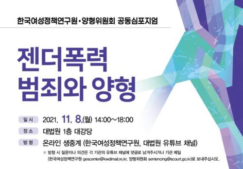 한국여성정책연구원은 대법원 양형위원회와 함께 오는 8일 오후 2시 서울 서초구 대법원 1층 대강당에서 '젠더폭력 범죄와 양형'을 주제로 심포지엄을 연다고 5일 밝혔다.