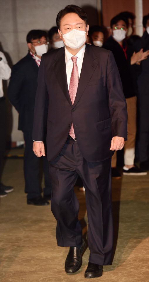 윤석열 국민의힘 대선 후보가 5일 오후 서울 용산구 백범김구기념관에서 열린 국민의힘 제2차 전당대회에서 단상에 오르고 있다.(사진=국회사진취재단) |