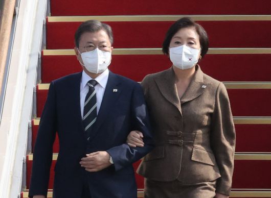 주요 20개국(G20) 정상회의와 제26차 유엔 기후변화협약 당사국총회(COP26) 참석 등 7박 9일간의 유럽 순방일정을 마친 문재인 대통령과 김정숙 여사가 5일 경기도 성남시 서울공항에 도착, 공군 1호기에서 내리고 있다.(사진=연합뉴스) |