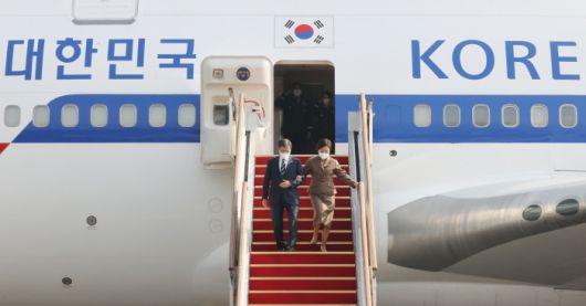 주요 20개국(G20) 정상회의와 제26차 유엔기후변화협약 당사국총회(COP26) 정상회의 참석 등 7박 9일간의 유럽 순방 일정을 마친 문재인 대통령과 김정숙 여사가 5일 경기 성남시 서울공항에 도착해 공군 1호기에서 내리고 있다. 연합뉴스 |