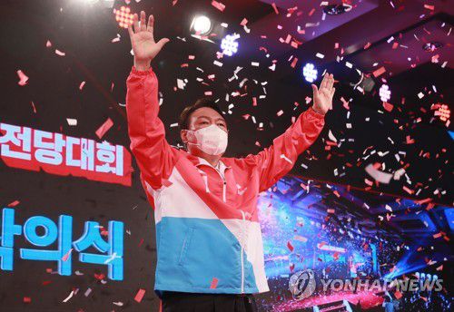 당 점퍼 입고 손 들어 인사하는 윤석열 대선후보 |